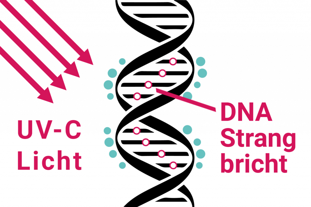 Der DNA Strang wird durch die UV-C Bestrahlung gebrochen. Viren, Bakterien und Pilze können sich nicht mehr reproduzieren.
